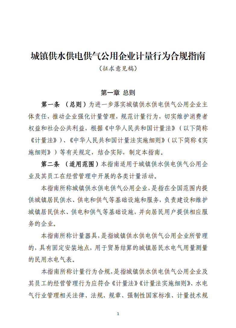 近日,市场监管总局发布《城镇供水供电供气公用企业计量行为合规指南(征求意见稿)》(以下简称《指南》),面向社会公开征求意见。意见反馈截止日期为9月3日。