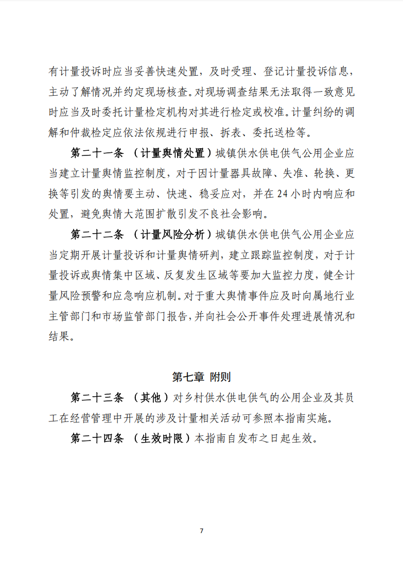 明确实施效力。《指南》明确规定自发布之日起施行。同时,考虑到对乡村供水供电供气的公用企业在计量管理方面与城镇具有一定的相似性,提出对乡村供水供电供气的公用企业的计量活动可参照本《指南》实施,有利于促进城乡公用事业的均衡发展,提升乡村居民的生活质量。